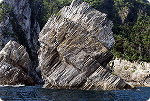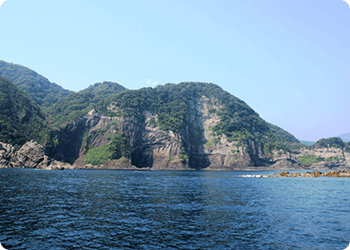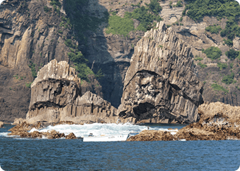 【国指定天然記念物・日本百景】香住海岸の一番の名勝。その大きさは圧巻です。高さ約65m、幅200mの大断崖は、縦に無数の柱状節理と横の板状節理が交わり、武士の鎧の袖のような崖面です。200万~300万年前の粗面岩質の岩床である。
