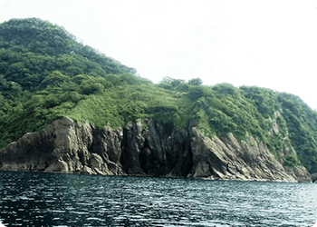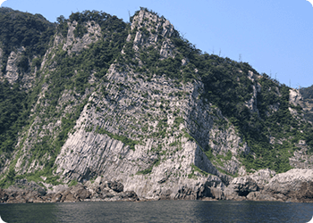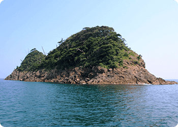 鎧の袖の左側に、海をじっと見つめるアメリカ先住民の酋長の横顔のような鷹の巣島。その昔、ミサゴという鷹科の鳥が島の頂上に巣を作ったことから名付けられました。見える角度によってはサザエのようにも見えます。